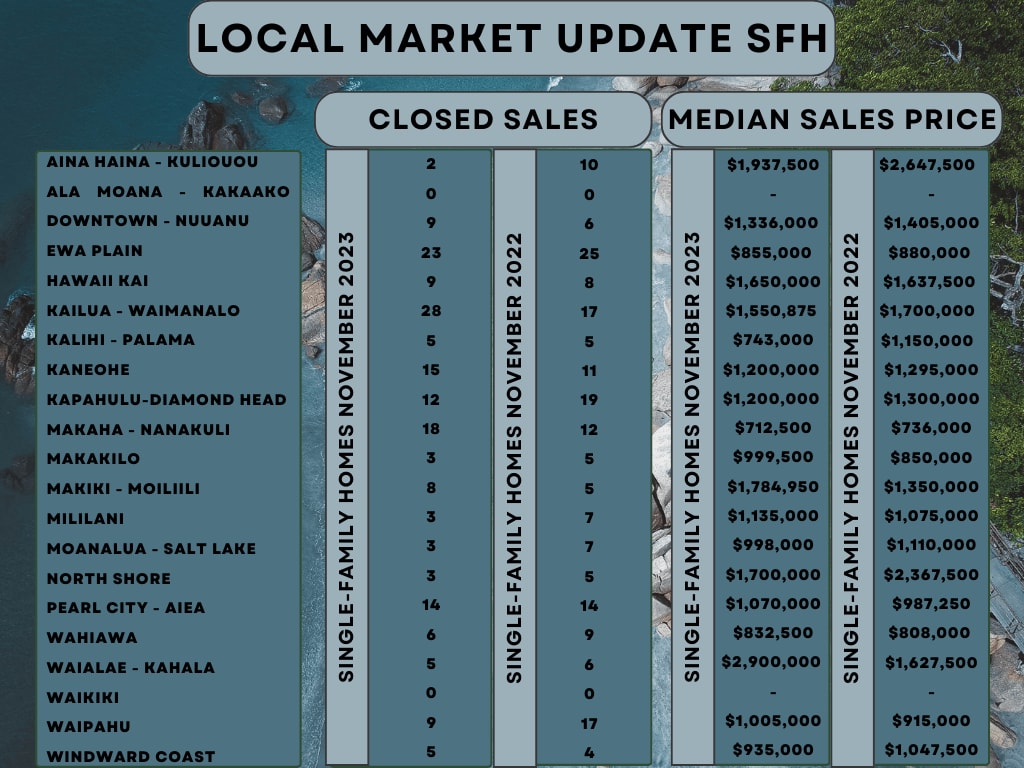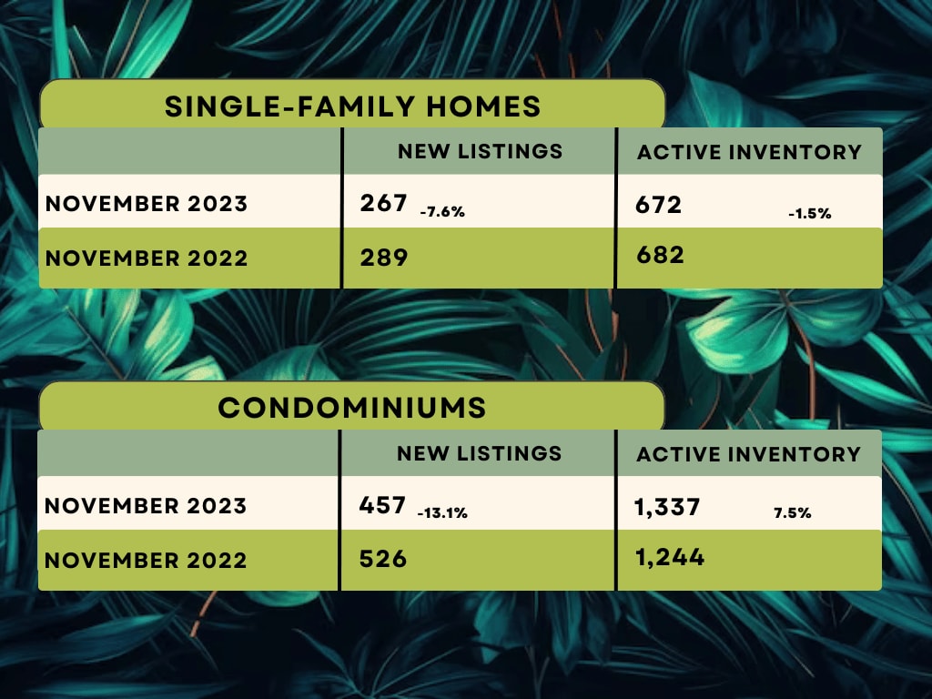 Properties took longer to sell in the current market, with both single-family homes and condos showing a median days on market of less than a month. Single-family homes, in particular, had a median days on market of 29 days, which is an increase from the 18 days observed in November 2022. Similarly, condos had a median days on market of 23 days, reflecting a five-day increase compared to the previous November.