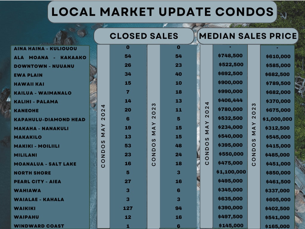 Condos also experienced an increase of 9.1% in sales, with 478 closed sales in May 2024 as from 438 in May 2023. Condos also saw a decrease of 2% in median sales price in May 2024.