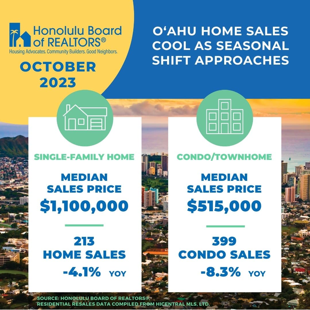 In October, the number of homes sold remained the same. Single-family houses and condos saw slight decreases compared to last year, with single-family homes down by 4.1% and condos down by 8.3%. The typical price for single-family homes went up by 4.8% to $1,100,000, while condos went down a bit by 1.0% to $515,000.