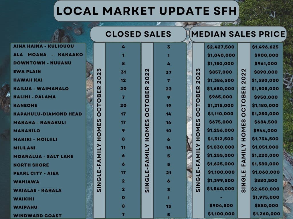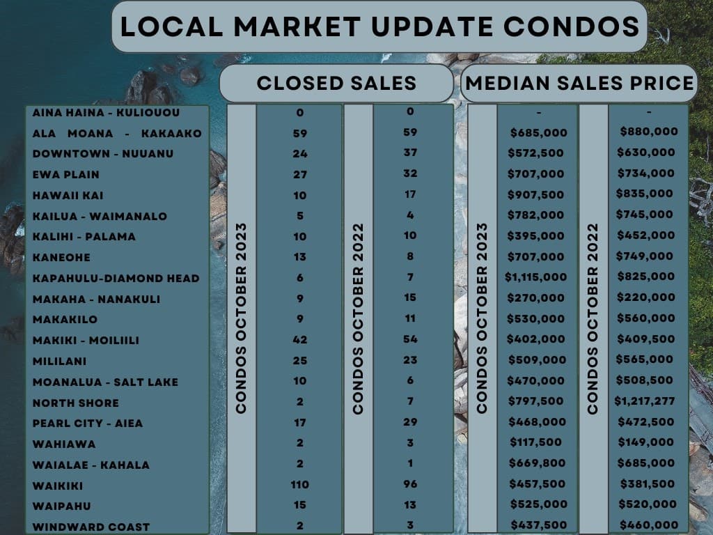 In total, 187 homes were sold for under $500,000, and most of them were condos. The number of single-family homes sold in the $800,000-$999,999 range went down by 25.6%. However, homes priced over $1,000,000 slightly increased to 127 closings, up from 122 in October 2022.