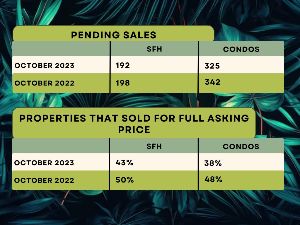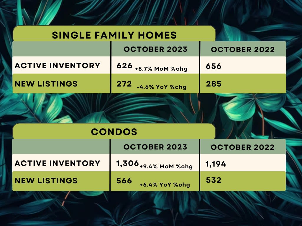 The number of new listings, however, compared to this month last year, displayed mixed results. In the single-family home market, there was a 4.6% decrease in new listings, dropping to 272 compared to 285 in October 2022. On the flip side, the condo market saw a 6.4% growth in new listing volume, totaling 566 new listings in October, up from 532 the previous year.