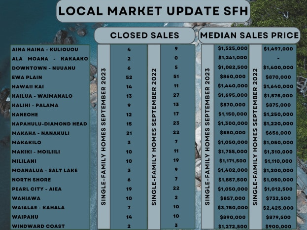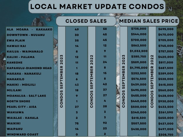 In some areas like the North Shore and Ewa Plain, there were fewer homes available, with drops of 46.7% and 17.6%, respectively. However, in Kane'ohe, there were 25% more single-family homes for sale, which means there were 10 more homes for sale compared to last year. When it comes to condos, most areas had more condos available, except for places like Hawai'i Kai, North Shore, and Ewa Plain, where there were only a few condos available at the end of September.